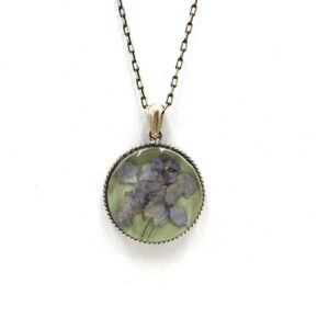 Madeni bronz, gerçek kurutulmuş ortanca çiçeği, kuyumcu işçiliği ile üretilmiştir, doğal ürün olduğundan çiçeklerin şekil ve renk tonlarında küçük farklılıklar oluşabilir, zincir uzunluğu 70 cm.